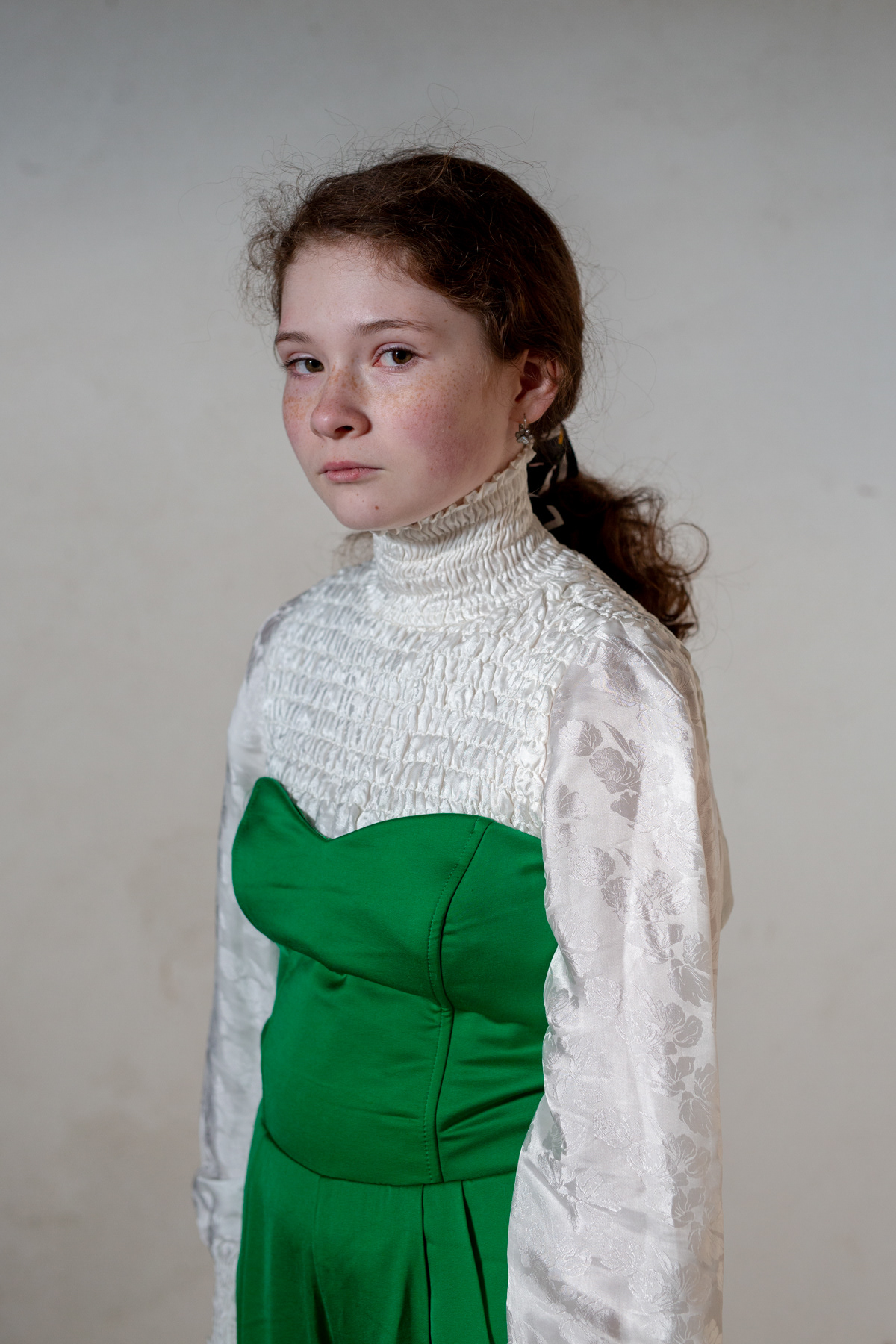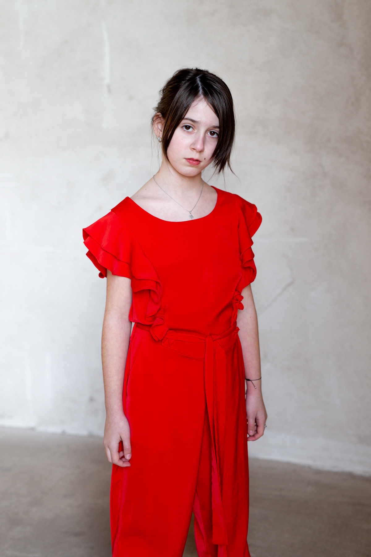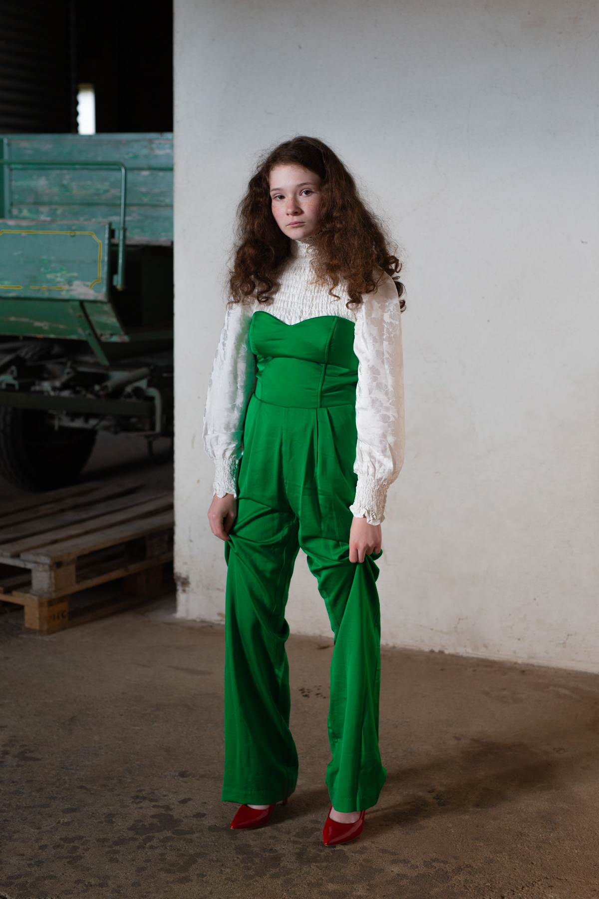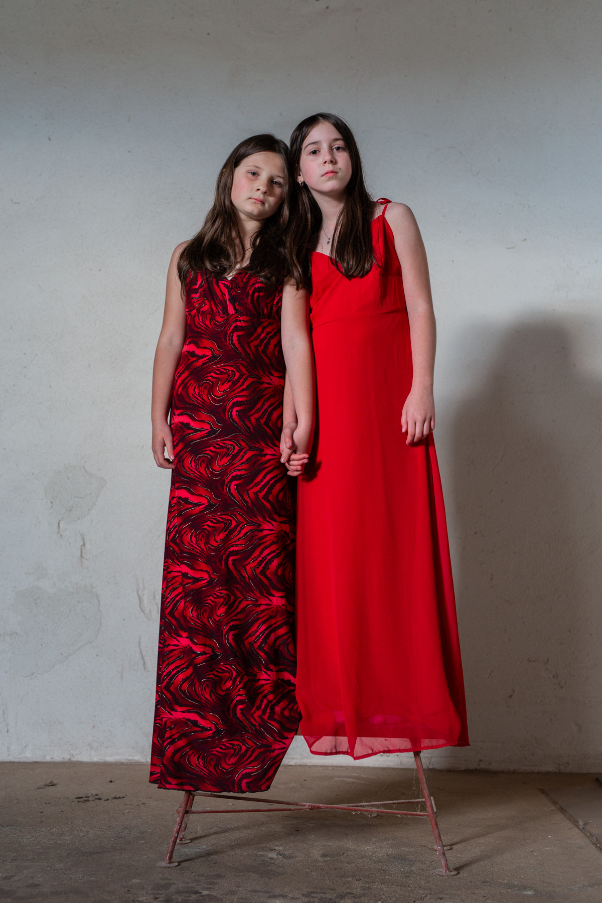Although the modelling industry is changing very slowly, it wasn't so long ago that fashion was being shown by skinny, tall girls around 15 years old who started their modelling carrier even earlier. The choice of clothing, make-up and lighting made these young models look like grown-up women in the photographs. The Dream Line ensemble reflects on the double situation that arose from this phenomenon. The adult women were buying the clothes presented by the young girls, comparing their bodies according to these inadequate standards. On the other hand, adolescent girls observed similar fashion campaigns, based on which they began to perceive the adult female body in an unhealthy way. So, as I was photographing, I asked myself, what could this phenomenon have done to the global perception of the adult female body by women themselves? I photographed ordinary girls aged 9-12 years old who are slowly entering puberty and still straddling the line between the world of children and girls. Their bodies are starting to become more or less shapely, and their interest in fashion is growing. In contrast to the whole situation, I dressed the girls in my own clothes as an adult woman and, apart from the question posed above, I perceived the paradox of the whole situation.