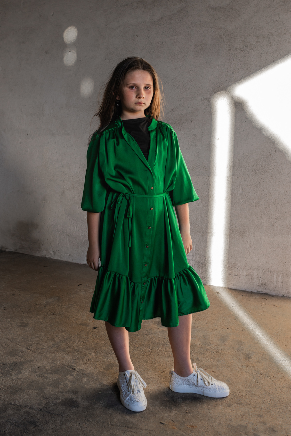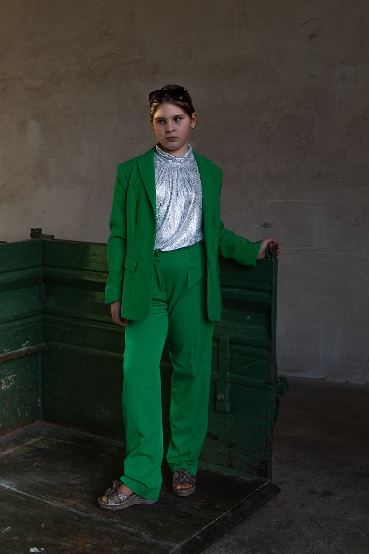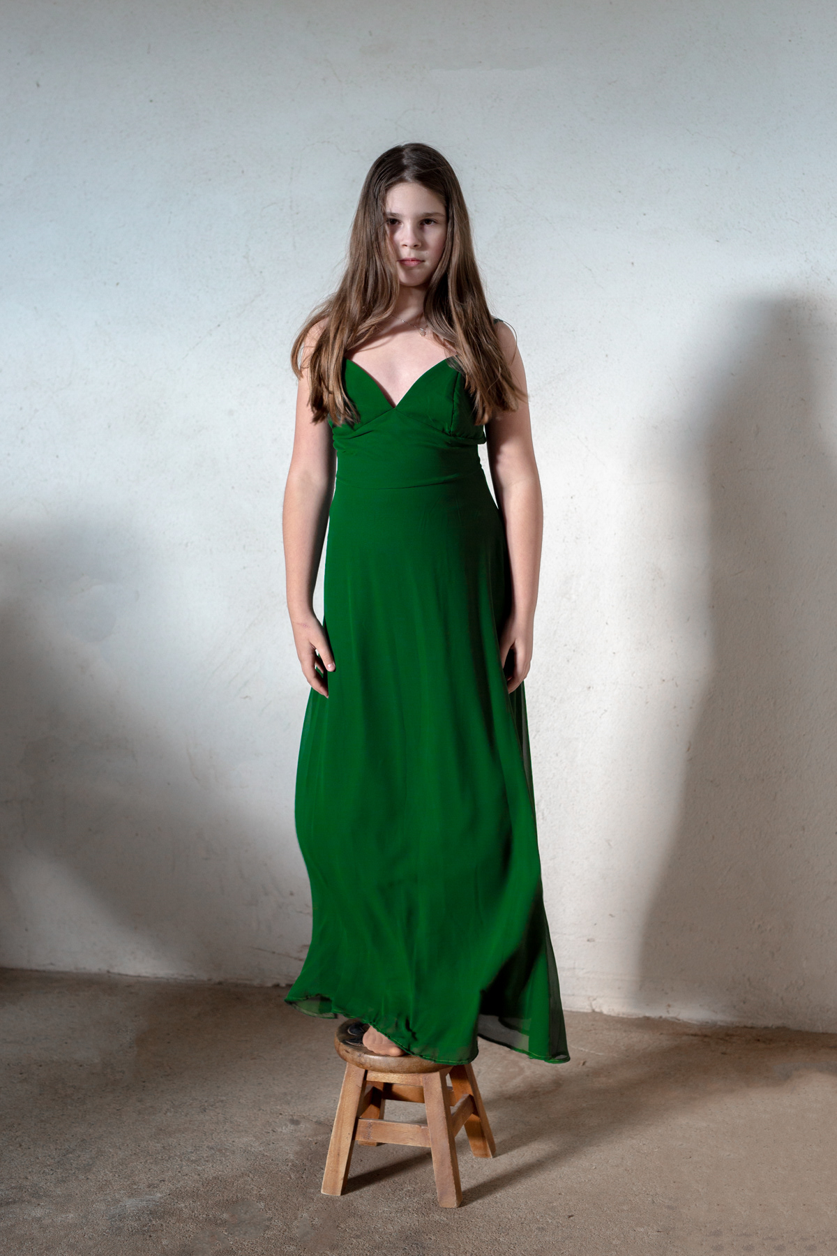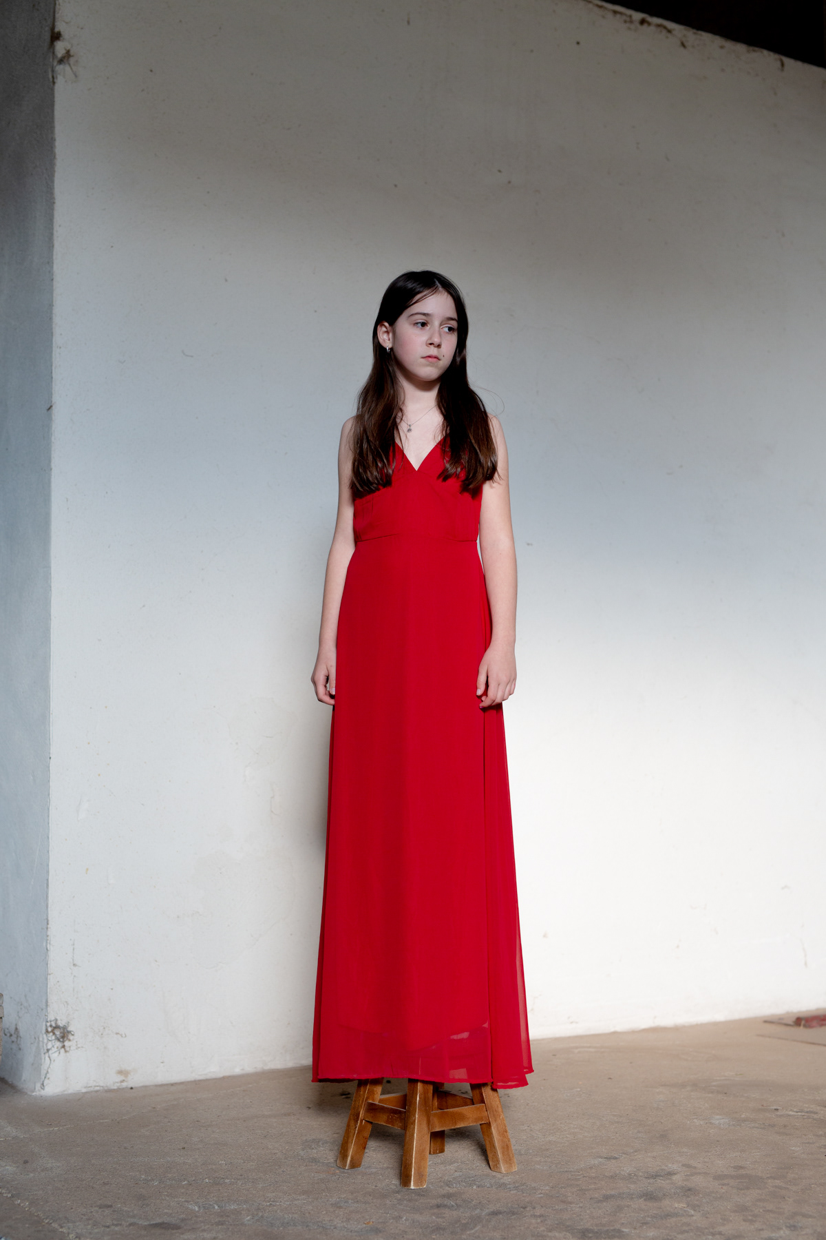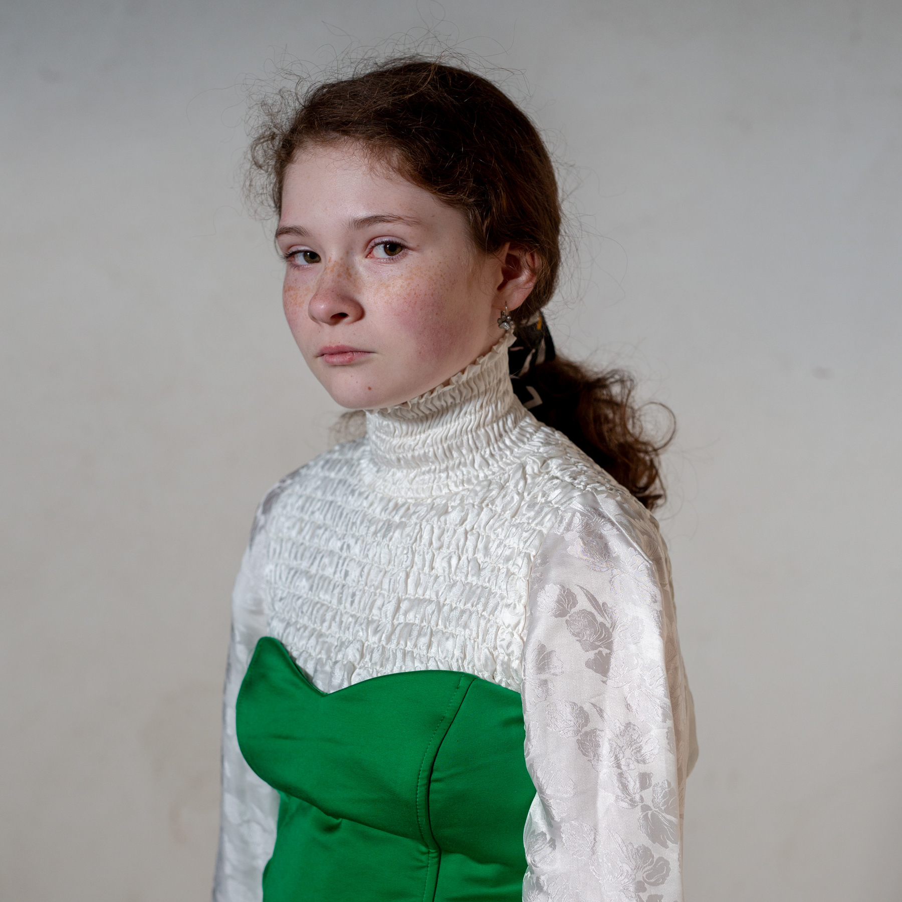 Although the modelling industry is changing very slowly, it wasn't so long ago that fashion was being shown by skinny, tall girls around 15 years old who started their modelling carrier even earlier. The choice of clothing, make-up and lighting made these young models look like grown-up women in the photographs. The Dream Line ensemble reflects on the double situation that arose from this phenomenon. The adult women were buying the clothes presented by the young girls, comparing their bodies according to these inadequate standards. On the other hand, adolescent girls observed similar fashion campaigns, based on which they began to perceive the adult female body in an unhealthy way. So, as I was photographing, I asked myself, what could this phenomenon have done to the global perception of the adult female body by women themselves? I photographed ordinary girls aged 9-12 years old who are slowly entering puberty and still straddling the line between the world of children and girls. Their bodies are starting to become more or less shapely, and their interest in fashion is growing. In contrast to the whole situation, I dressed the girls in my own clothes as an adult woman and, apart from the question posed above, I perceived the paradox of the whole situation.